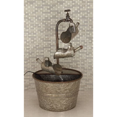 - •This metal fountain has a round basin reservoir in gray finish and features water tubing, faucet, and scooper-inspired deck