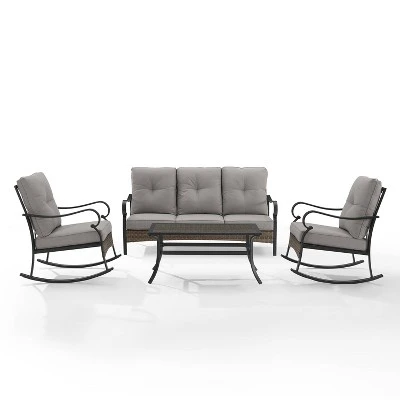 The Dahlia 4pc Sofa Set charms with traditional elements like curved arms and x-back seating. Constructed of powder-coated steel, the sofa and rocking chairs offer deep cushioned seats covered in spun polyester. The coffee table has a resin wicker top covered in tempered glass, which complements the wicker accents along the base of the seating. The Dahlia sofa set will be a unique addition to your patio or deck.
