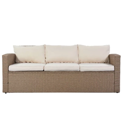 Coming with a three seat sofa, two chairs and a dining table, this set covers all the basics of outdoor lounging in a quality package. Thick frames provide anti-wobble stability while the wide arc arm rests provide ample room for laying out and relaxing. This patio set is crafted for weather resistance, with its tightly woven PE rattan material that is resistant to water, dust and untimely cracking and chipping. With the seating featuring an ergonomic curved silhouette, users are enabled to truly lean back and get comfortable, while the spacious center table features eye-catching wood planking texture for a polished look.Take living room lounging outdoors with this complete 4-piece patio dining set, a great option for relaxing, having meals and entertaining guests while enjoying the fresh air.