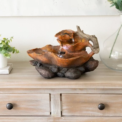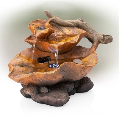 Enjoy the meditative sounds of nature indoors with the Alpine Corporation Leaf Tabletop Fountain! Take in the tranquil sounds of the water gently cascading over natural-looking leaves and aged bark in the comfort of your own home. This fountain is perfect for tabletops in your office, entryway, or out on your patio or yard. The resin, stone powder, and fiberglass construction is weatherproof, rust-resistant, and durable for years of quality use. LED lights illuminate your space, drawing attention to the relaxing water pools day or night for added ambiance. To use, simply plug into an outlet, fill lower level with water, and watch as the interior pump creates a lovely water flow reminiscent of a lush rainforest. Due to the hand-painted nature of the product, color variations may occur. With a 1-year warranty, you can be confident in the quality of your purchase. Fountain measures 14″L x 9″W x 9″H, perfect for tabletops.