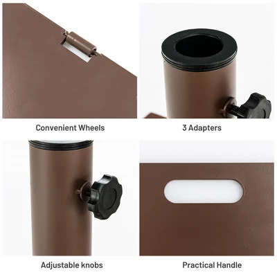 Designed with modern appearance, it will be a perfect addition whether for family or commercial. It can be used in all weather with the large umbrella cover of 10” to resist both sun and rain. As it is tilting, there is no illumination discomfort. Combined with the crank lift system, it will be much easier to use. The push-button tilt adds longevity to your umbrella by separating the tilt feature from the handy open/close crank. And a 50lbs umbrella stand can keep the umbrella stable when using it. Its rotatable wheels also allow you to move your umbrella around with little effort.