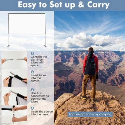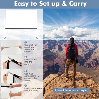 - Easy to Carry & Wide Application: Thanks to its lightweight and included carrying bag,the portable projection screen with stand is easy to carry. Additionally,the projector screen can be used both indoors and outdoors,such as home theater,backyard movies,weddings,school teaching,conference room presentations,playing games,watching sporting events,camping,etc.
