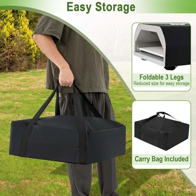 - Portable & Easy Storage: Designed with foldable 3 legs, the pizza oven can be fold down to reduced size for easy storage. What’s more, with carry bag included, the oven can be easily carried in the trunk or in other vehicles for easy transport.
