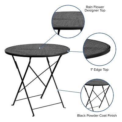 Brighten up your patio space with this beautiful black folding patio table. The rain flower printed top is very appealing. This table will enhance your bistro, cafe, restaurant, hotel or home patio space. With the convenience of a folding table you can use it as a temporary placement or fold away for storage or cleaning the space. Quickly unfold the table by pulling the center brace. The table was designed for all-weather use making it a great option for indoor and outdoor settings. For longevity, care should be taken to protect from long periods of wet weather.