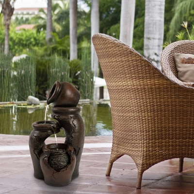 Create relaxing ambience in any outdoor area with the Nature Spring 3-Tiered Clay Pot Fountain! The contemporary, waterfall style fountain features a cascading water flow down the hand-painted pots. Between the peaceful aesthetic and soothing water sounds, this lovely décor piece is sure to add a touch of serenity to your patio, deck, or any backyard space! Dimensions: 11.5″ L x 13″ W x 22″ H. Cord Length: 72″.
