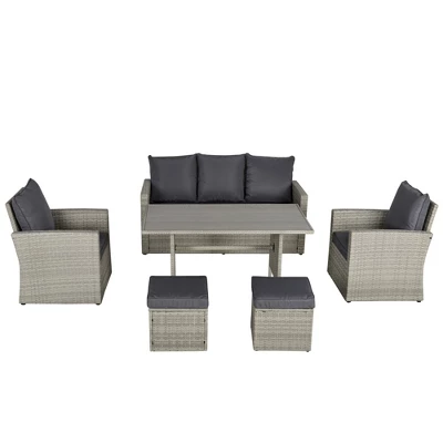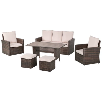 - 6 PCS RATTAN DINING SET: This 6 piece wicker furniture set includes 2 single chairs, 1 three-seat sofa, 1 dining table, and 2 footstool ottomans. Seat 7 people at the same time in a stylish and comfortable setting. Suitable for outdoor patios, porches, backyards, balconies, poolside, gardens, and more.