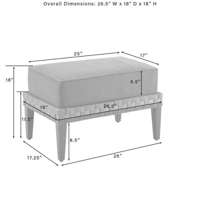 Kick up your feet and catch some sun with the Prescott Ottoman. Wrapped in all-weather wicker, this ottoman is resistant to the whims of mother nature. The wide wicker is beautifully weathered and has the textured feel of natural fiber. With its thick, moisture-resistant cushion, the Prescott Ottoman can double as extra seating for your outdoor retreat.
