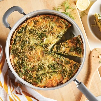 Featuring vibrant, shimmering color combined with value-driven functionality, this family-sized fry pan brings on Rachael’s always-reliable performance with durable aluminum construction for ultra-even heating and browning. Made with higher sides for an enhanced cooking surface, this smart skillet features PlatinumShield™ Technology silver nonstick reinforced to be 9X harder than titanium for effortless food release of the stickiest recipes like Rach’s Spinach-Artichoke Cheesy Tortellini or her Peppers ‘n’ Potatoes Beef Frying Pan Supper. Even better, the frying pan is dishwasher safe for quick and easy cleanup.