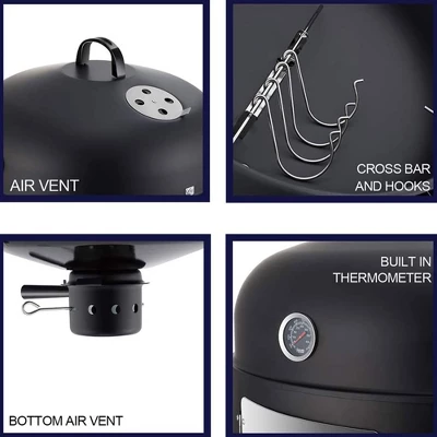 Savor tender and flavorful foods in your own backyard with the 20-inch Vertical Steel Charcoal Outdoor Smoker from Realcook. Offering different ways to prepare a meal, this smoker can be used as a fire pit for cold weather, and as an adjustable barrel grill for grilling, steaming, baking, braising, roasting, and more.A built-in thermometer, bottom damper, and ash collector let you easily control the bottom airflow to maintain a steady temperature inside the smoker. You can easily remove the ash cup and dump it in seconds. A 636 square inch cooking surface with 2 cooking racks, this vertical smoker accommodates large cuts of meat for smoking and 4 hangers inside the lid for hanging meats.Constructed in parts, this smoker can easily be taken apart for storage or transportation. The impressive Latch-Locking system secures the layers together for added stability when the smoker is in use. Dual access doors allow you to check on your food or tend to your charcoal without removing the top layer and losing heat.Experience a new way of cooking with the 20-inch Vertical Charcoal Smoker from Realcook.
