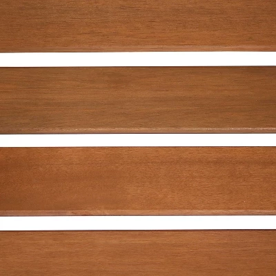 Enjoy great conversation and cool drinks outside on the balcony or in the backyard with this Meranti wood jack-and-jill outdoor furniture set. Constructed of meranti wood with a beautiful teak oil finish, this outdoor furniture set takes the guesswork out of coordinating furniture as it is two chairs and one table all in one piece. This set stands strong and durable against outdoor elements. The table features a handy shelf that is perfect for storing towels for the poolside or soft blankets when it gets chilly. Everything needed to assemble this unique piece of furniture is in the box, including the components, hardware, and tools. This all-in-one furniture set is perfect for small spaces, like apartment balconies, or to supplement other pieces of outdoor furniture on the patio or in the backyard. Sit comfortably with friends and family members while enjoying a cup of tea, beautiful sights, and fresh air.