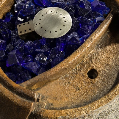- INCLUDED: One freestanding water fountain pot features a fire pit with blue fire glass and burning torch on top. BTU: 8,000. Water Capacity: 1.72 gallons