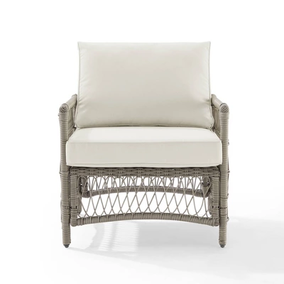 Create the look of an island retreat with the Thatcher Armchair. Featuring a sturdy steel frame wrapped in beautiful resin wicker, this chair will add comfort and style to your porch or patio. Cozy up in the chair’s deep seating which features thick, weather-resistant cushions. The simple silhouette of the Thatcher Armchairs blends with a variety of designs, while the mix of open and braided wicker adds a unique quality to any outdoor space.